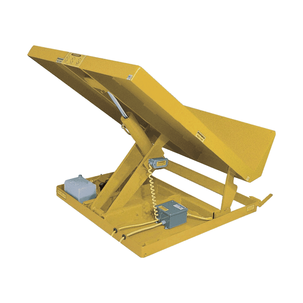 Esta mesa elevadora con inclinación cuenta con un diseño de tijera cuenta con un borde alto en el lado de inclinación, ideal para la manipulación y manejo de piezas. El pedal selector permite al operario levantar mientras inclina y levantar. El motor es de serie totalmente cerrado con voltajes opcionales disponibles. Otras características estándar incluyen control manual de dos botones, bloqueo de mantenimiento integrado, bomba de presión, válvula de flujo compensada por presión, válvula de descenso, retorno de aceite independiente e interruptor de ascenso ajustable. La mesa de tijera debe estar fijada al suelo.